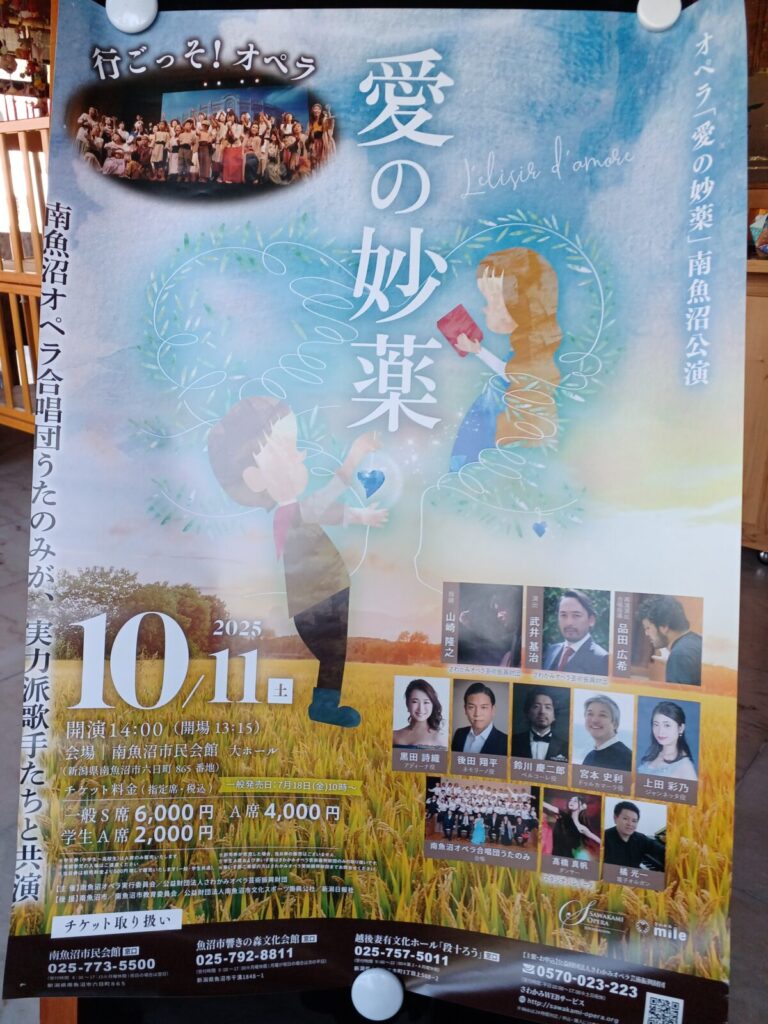 地元合唱団がプロのオペラ歌手の皆様と共に舞台に上がる、本格的オペラ「愛の妙薬」を観て参りました。今年で3回目の公演。年々磨きがかかる地元の皆さんの演技、歌声に感動します。