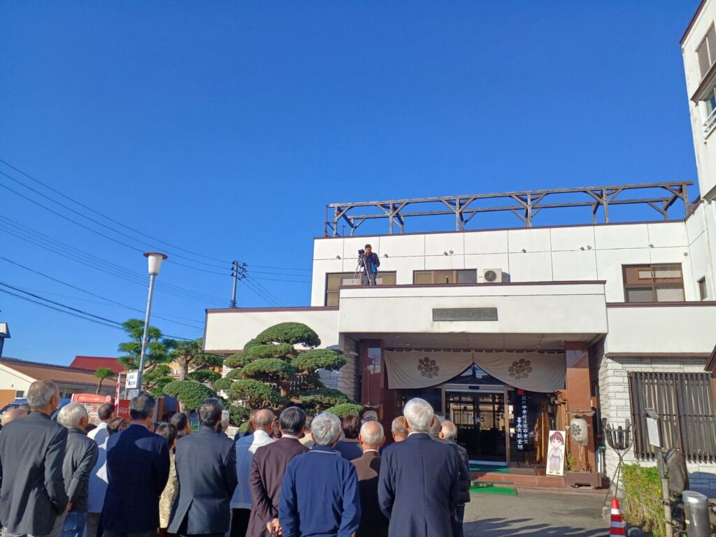 これから始まる喜寿同級会。青空のもと、先ずは玄関前で記念撮影。