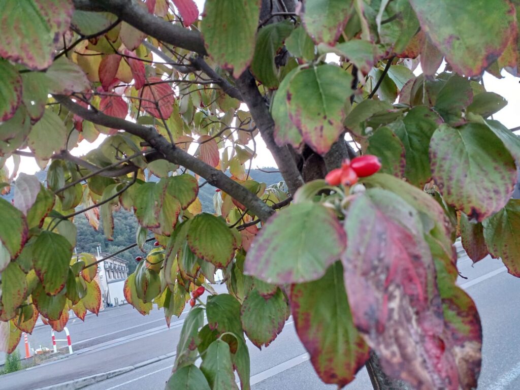 熊さん情報に怯えつつの朝散歩途中、街路樹に可愛い赤い実を発見。